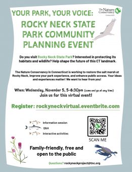 The Nature Conservancy, CTNERR, and other partners are working to restore the salt marsh at Rocky Neck State Park, inprovie your park expeerience, and expand public access. Your ideas and experiences are important to us. Please join us for this free, family-friendly community meeting.